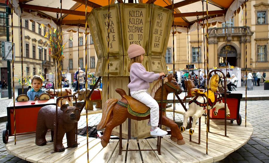 PRAGUE, 30 mars (Xinhua) -- Des enfants font un tour de manège traditionnel pendant la fête de Pâques à Prague, en République tchèque, le 29 mars 2024. (Xinhua/Dana Kesnerova)Un enfant pose devant un œuf de Pâques géant pendant la fête de Pâques à Prague, en République tchèque, le 29 mars 2024. (Xinhua/Dana Kesnerova)Des enfants regardent une représentation théâtrale pendant la fête de Pâques à Prague, en République tchèque, le 29 mars 2024. (Xinhua/Dana Kesnerova)