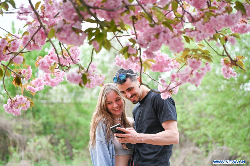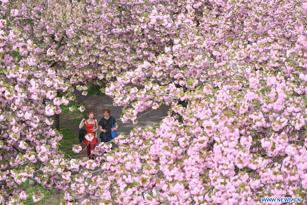 BERLIN, 9 avril (Xinhua) -- Des gens se baladent sous des cerisiers en fleurs à Berlin, en Allemagne, le 9 avril 2024. (Xinhua/Ren Pengfei)