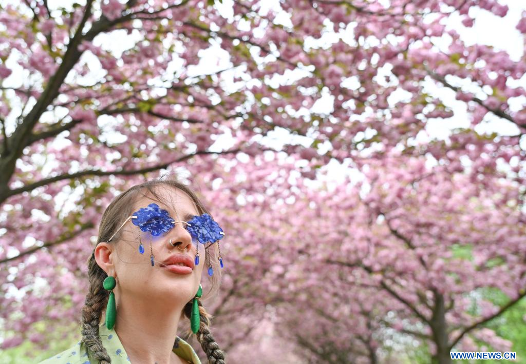 BERLIN, 9 avril (Xinhua) -- Une femme regarde des cerisiers en fleurs à Berlin, en Allemagne, le 9 avril 2024. (Xinhua/Ren Pengfei)