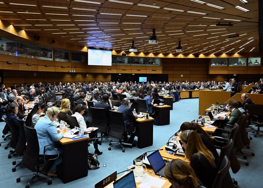 VIENNE, 11 avril (Xinhua) -- Photo prise le 11 avril 2024 d'une réunion spéciale du Conseil des gouverneurs de l'Agence internationale de l'énergie atomique (AIEA) à Vienne, en Autriche. Le directeur de l'AIEA, Rafael Grossi, a appelé jeudi à la "plus grande retenue" après les attaques de drones menées dimanche contre la centrale nucléaire de Zaporijjia, qui, selon lui, ont considérablement accru le risque d'accident nucléaire. (AIEA/via Xinhua)Rafael Grossi (à gauche), directeur général de l'Agence internationale de l'énergie atomique (AIEA), assiste à une réunion spéciale du Conseil des gouverneurs de l'AIEA à Vienne, en Autriche, le 11 avril 2024. (Xinhua/He Canling)Li Song (à droite), représentant permanent de la Chine auprès de l'Agence internationale de l'énergie atomique (AIEA), s'exprime lors d'une réunion spéciale du Conseil des gouverneurs de l'AIEA à Vienne, en Autriche, le 11 avril 2024. La Chine soutient les efforts de l'AIEA pour jouer un rôle constructif dans la sécurisation des installations nucléaires de Zaporijjia après les récentes frappes de drones contre la centrale. (Mission permanente de la Chine auprès des Nations Unies et d'autres organisations internationales à Vienne/via Xinhua)