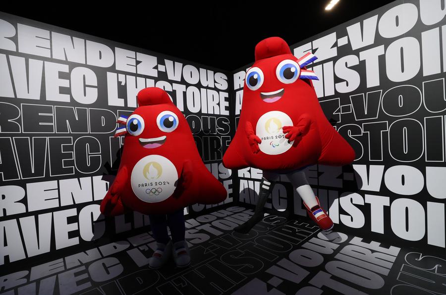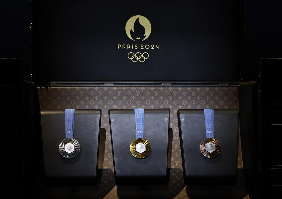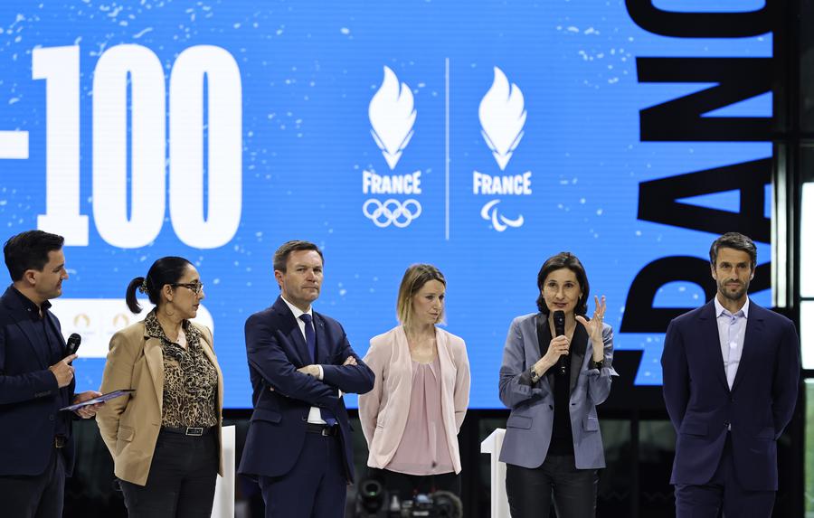 PARIS, 18 avril (Xinhua) -- Cette photo prise le 17 avril 2024 montre les médailles des Jeux olympiques de Paris exposées lors d'une cérémonie célébrant le compte à rebours des 100 jours avant les JO de Paris 2024 sur le site du Grand Palais Ephémère à Paris, en France. (Xinhua/Gao Jing)Cette photo prise le 17 avril 2024 montre les mascottes des Jeux olympiques et paralympiques de Paris exposées lors d'une cérémonie célébrant le compte à rebours des 100 jours avant les Jeux olympiques de Paris 2024 sur le site du Grand Palais Ephémère à Paris, en France. (Xinhua/Gao Jing)Cette photo prise le 17 avril 2024 montre la torche des Jeux olympiques de Paris exposée lors d'une cérémonie célébrant le compte à rebours des 100 jours avant les JO de Paris 2024 sur le site du Grand Palais Ephémère à Paris, en France. (Xinhua/Gao Jing)Le président du Comité d'organisation des Jeux olympiques de Paris 2024, Tony Estanguet (1er à droite), la ministre française des Sports Amélie Oudéa-Castéra (2e à droite) et d'autres invités participent à une cérémonie célébrant le compte à rebours des 100 jours avant les Jeux olympiques de Paris 2024 sur le site du Grand Palais Ephémère à Paris, en France. (Xinhua/Gao Jing)