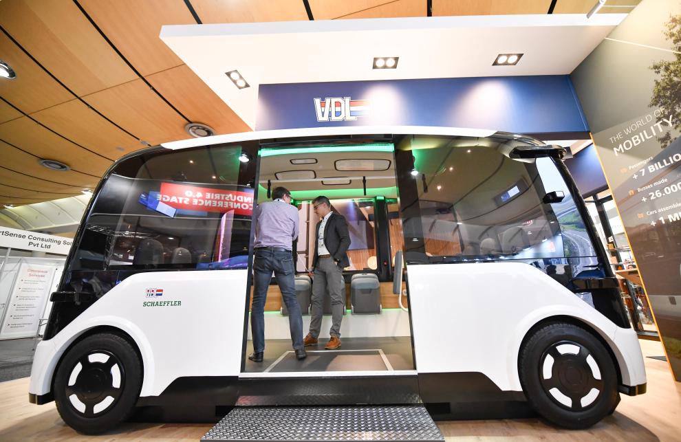 Des visiteurs regardent une navette à conduite autonome à la Foire de Hanovre, à Hanovre, en Allemagne, le 22 avril 2024.(Xinhua/Ren Pengfei)