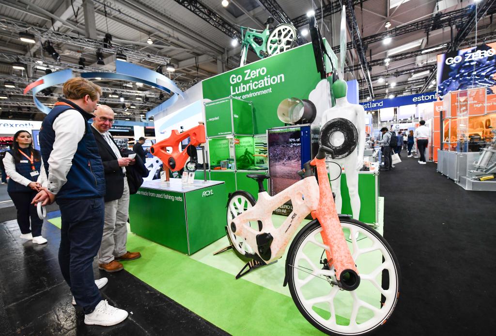 Des visiteurs observent un vélo en plastique recyclé à la Foire de Hanovre, à Hanovre, en Allemagne, le 22 avril 2024. (Xinhua/Ren Pengfei)