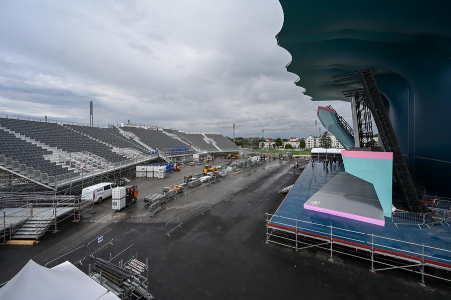 LE BOURGET (France), 31 mai (Xinhua) -- Photo prise le 30 mai 2024 montrant la tribune en cours de construction du site d'escalade du Bourget, près de Paris, en France. Le site accueillera des épreuves d'escalade pendant les Jeux olympiques de Paris 2024. (Xinhua/Julien Mattia)