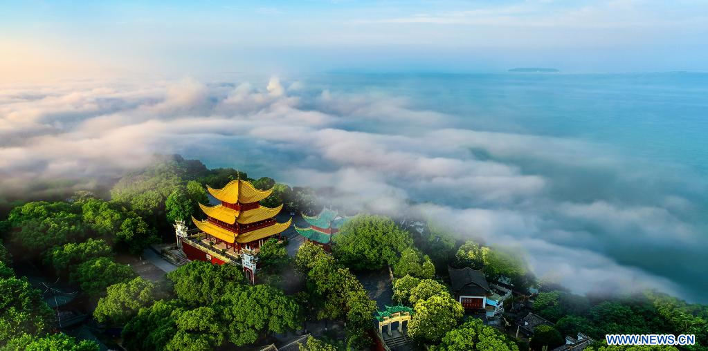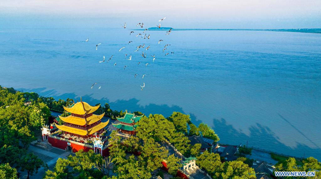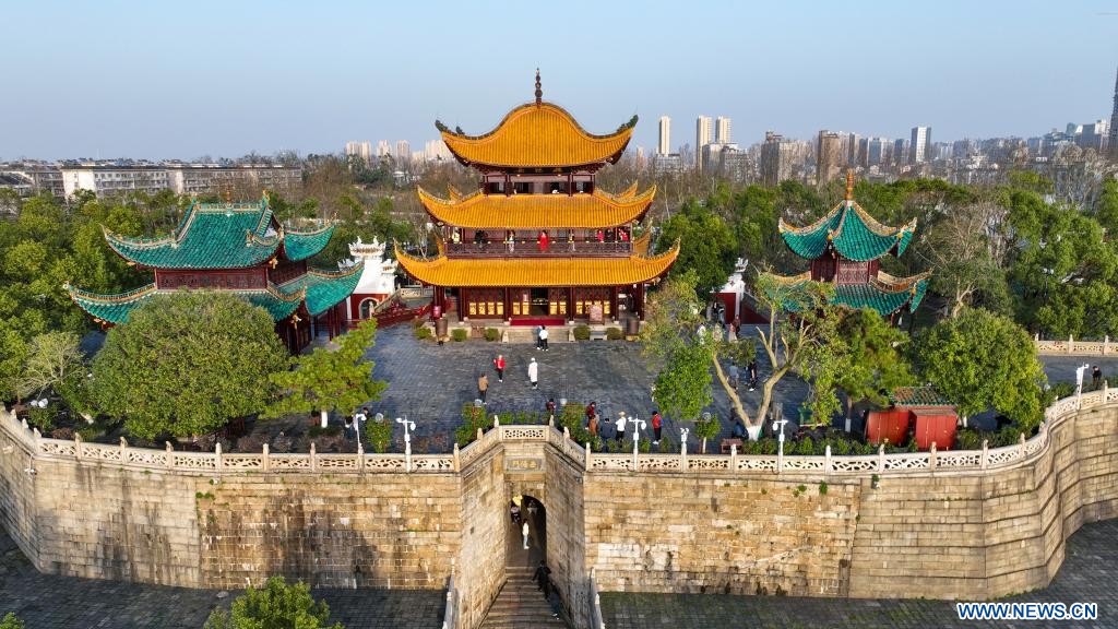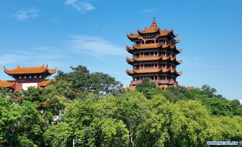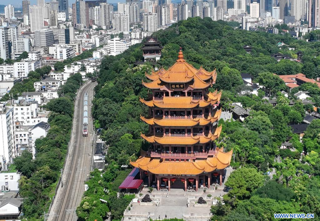 Photo aérienne prise par un drone le 3 juin 2024 montrant une vue de la Tour de la grue jaune dans la ville de Wuhan, dans la province chinoise du Hubei (centre). La Tour de la cigogne dans la province du Shanxi, le Pavillon Tengwang dans la province du Jiangxi, la Tour de Yueyang dans la province du Hunan et la Tour de la grue jaune dans la province du Hubei, quatre monuments emblématiques de la région centrale de la Chine, attirent les touristes avec leur art architectural exquis, leurs paysages magnifiques et leur histoire et culture profondes. (Xinhua/Cheng Min)