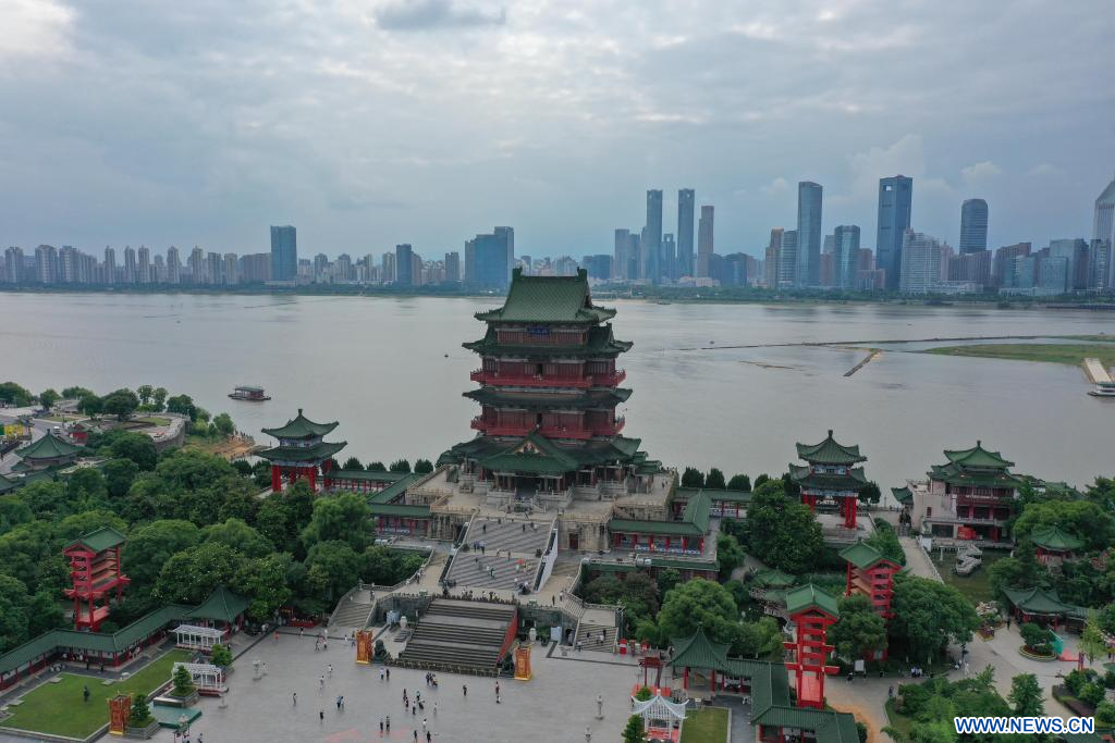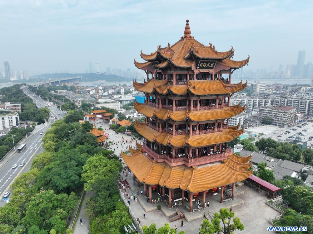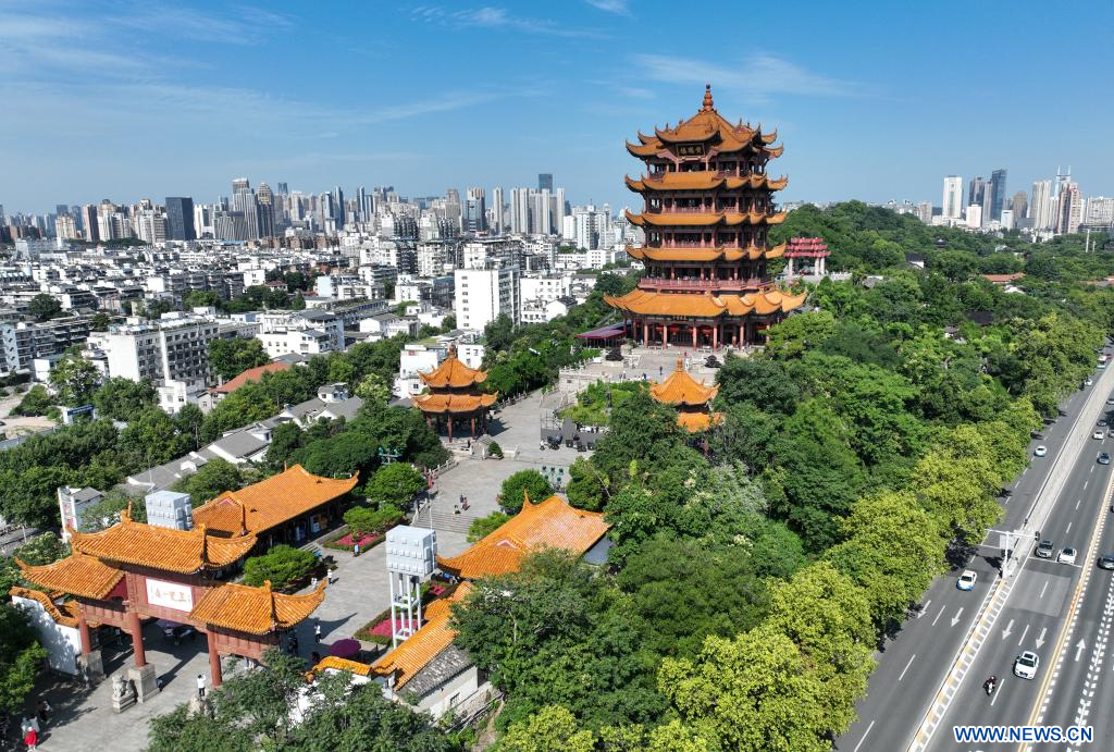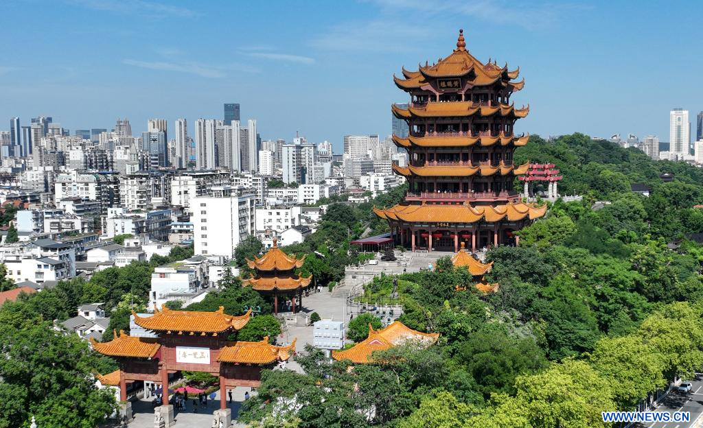 Photo aérienne prise par un drone le 3 juin 2024 montrant une vue de la Tour de la grue jaune dans la ville de Wuhan, dans la province chinoise du Hubei (centre). (Xinhua/Cheng Min)
