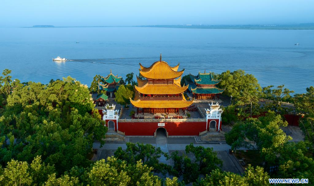 Photo aérienne prise par un drone le 16 juin 2024 montrant une vue de la Tour de Yueyang dans la ville de Yueyang, dans la province chinoise du Hunan (centre). (Xinhua/Li Min)