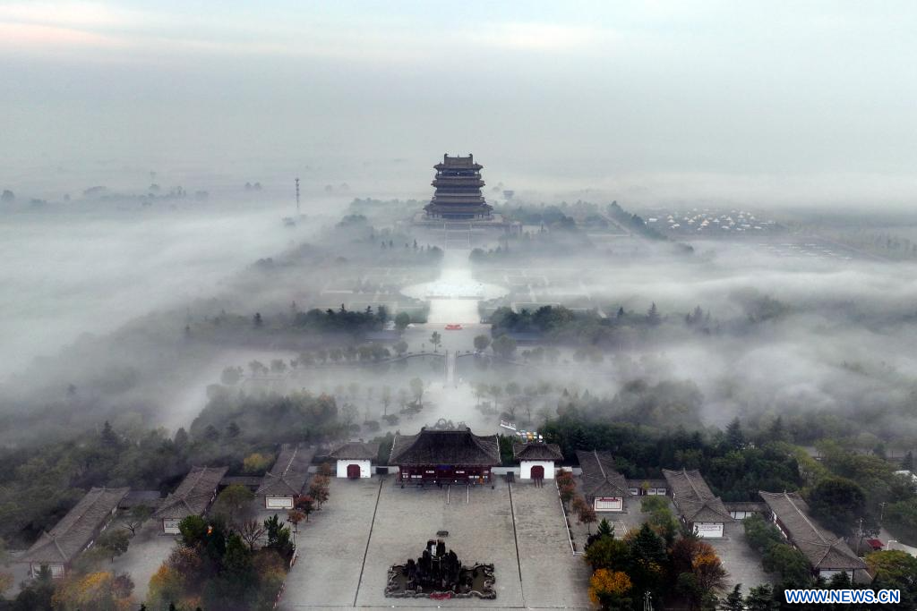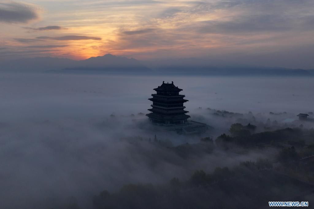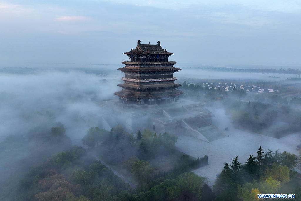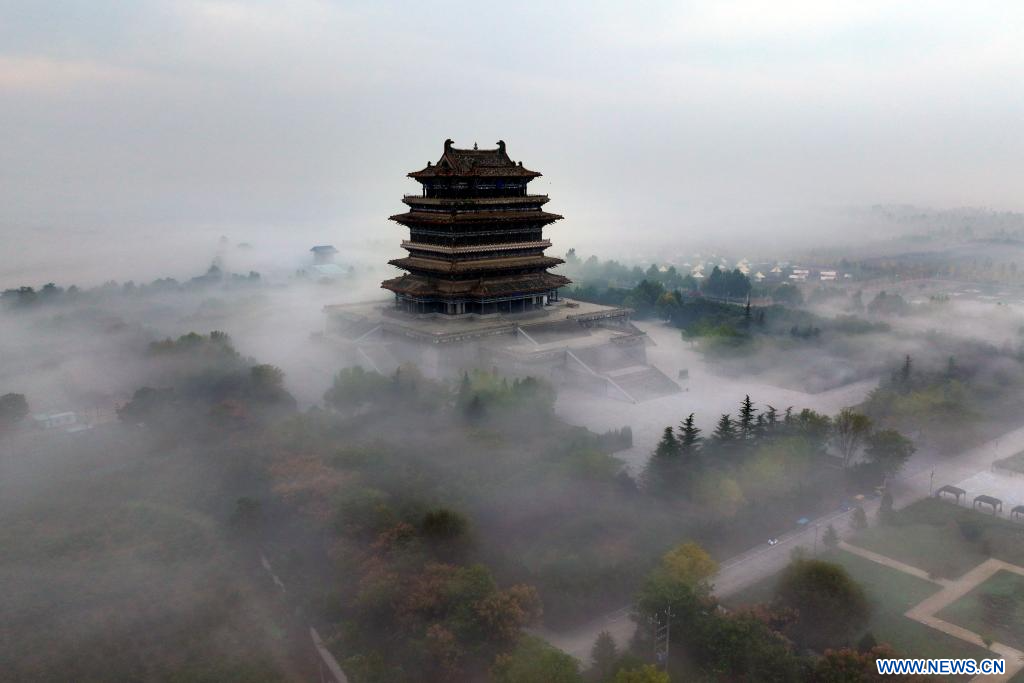 Photo aérienne prise par un drone le 26 octobre 2023 montrant une vue de la Tour de la cigogne, aussi connue comme Guanquelou en chinois, dans la ville de Yongji, dans la province chinoise du Shanxi (centre). (Xinhua/Chen Chunming)