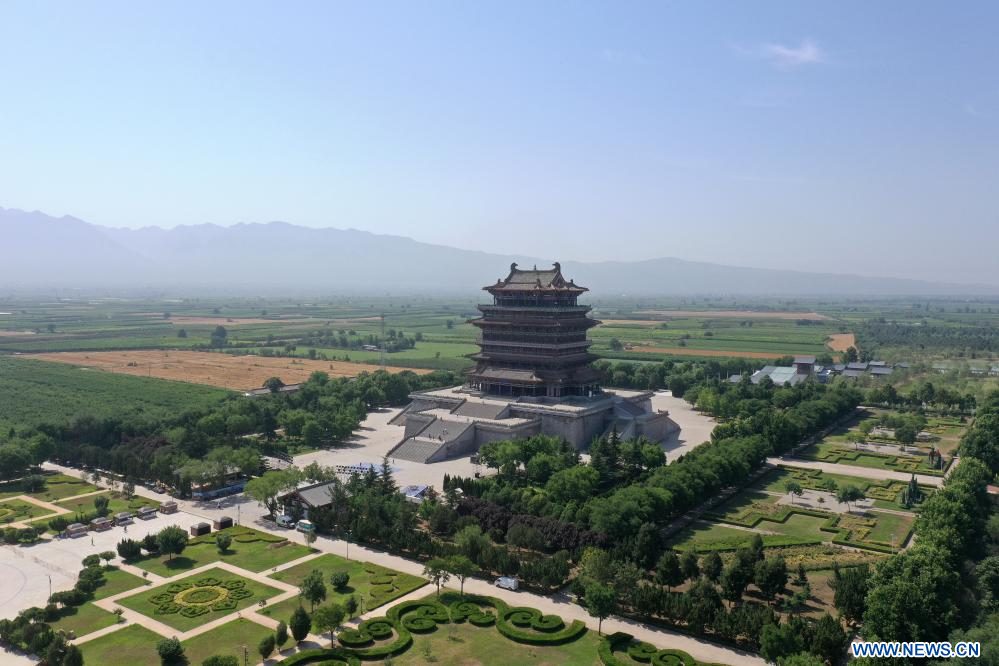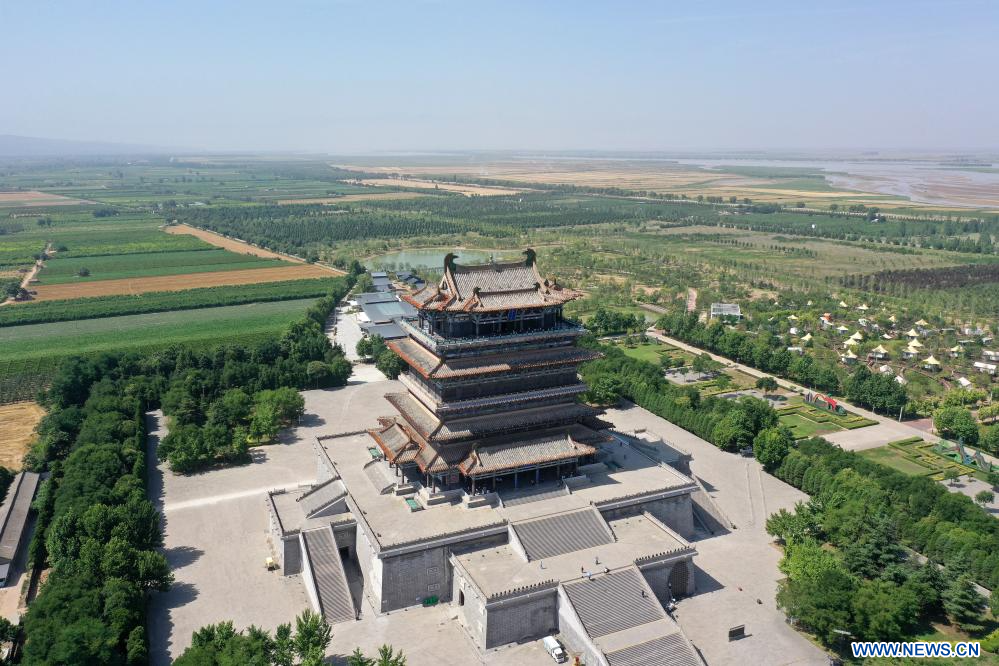 Photo aérienne prise par un drone le 12 juin 2024 montrant une vue de la Tour de la cigogne, aussi connue comme Guanquelou en chinois, dans la ville de Yongji, dans la province chinoise du Shanxi (centre). (Xinhua/Zhan Yan)