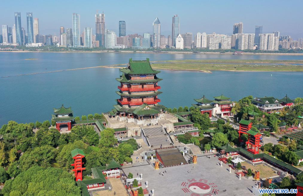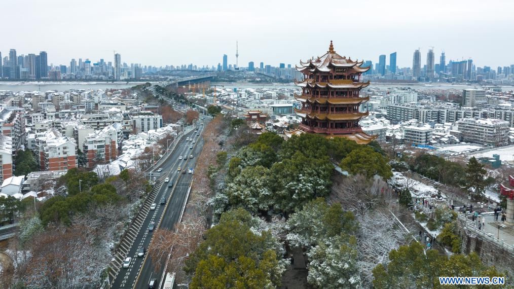 Photo aérienne prise par un drone le 15 janvier 2023 montrant une vue de la Tour de la grue jaune dans la ville de Wuhan, dans la province chinoise du Hubei (centre). (Xinhua/Xiao Yijiu)