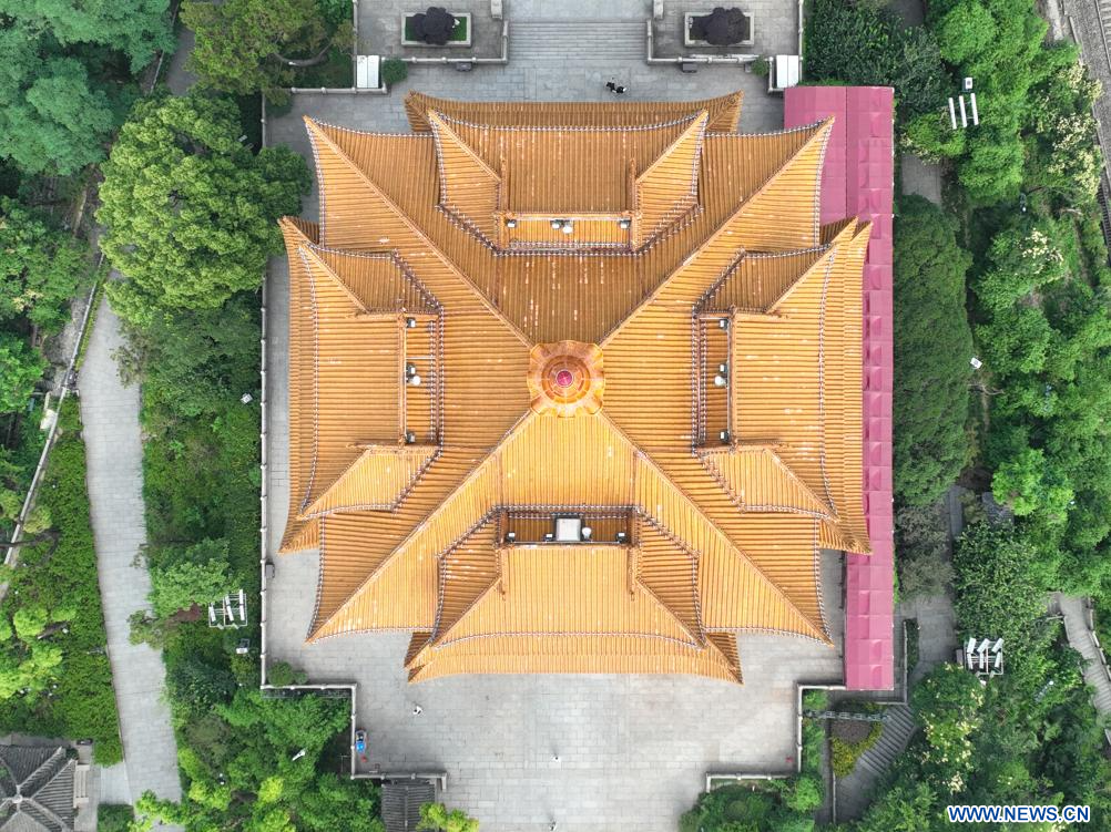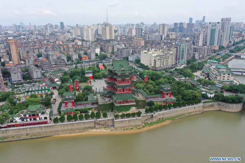Photo aérienne prise par un drone le 6 juin 2024 montrant une vue du Pavillon Tengwang dans la ville de Nanchang, dans la province chinoise du Jiangxi (centre). (Xinhua/Zhou Mi)