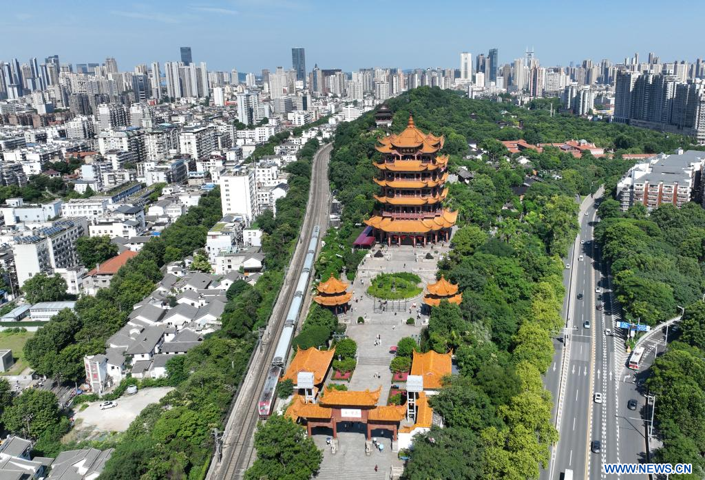Photo aérienne prise par un drone le 1er juin 2024 montrant une vue de la Tour de la grue jaune dans la ville de Wuhan, dans la province chinoise du Hubei (centre). (Xinhua/Cheng Min)
