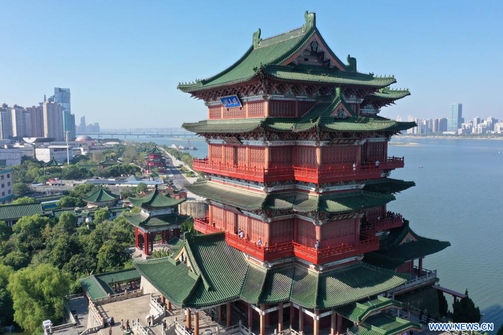 Photo aérienne prise par un drone le 6 novembre 2023 montrant une vue de la Tour de Yueyang dans la ville de Yueyang, dans la province chinoise du Hunan (centre). (Xinhua/Li Min)