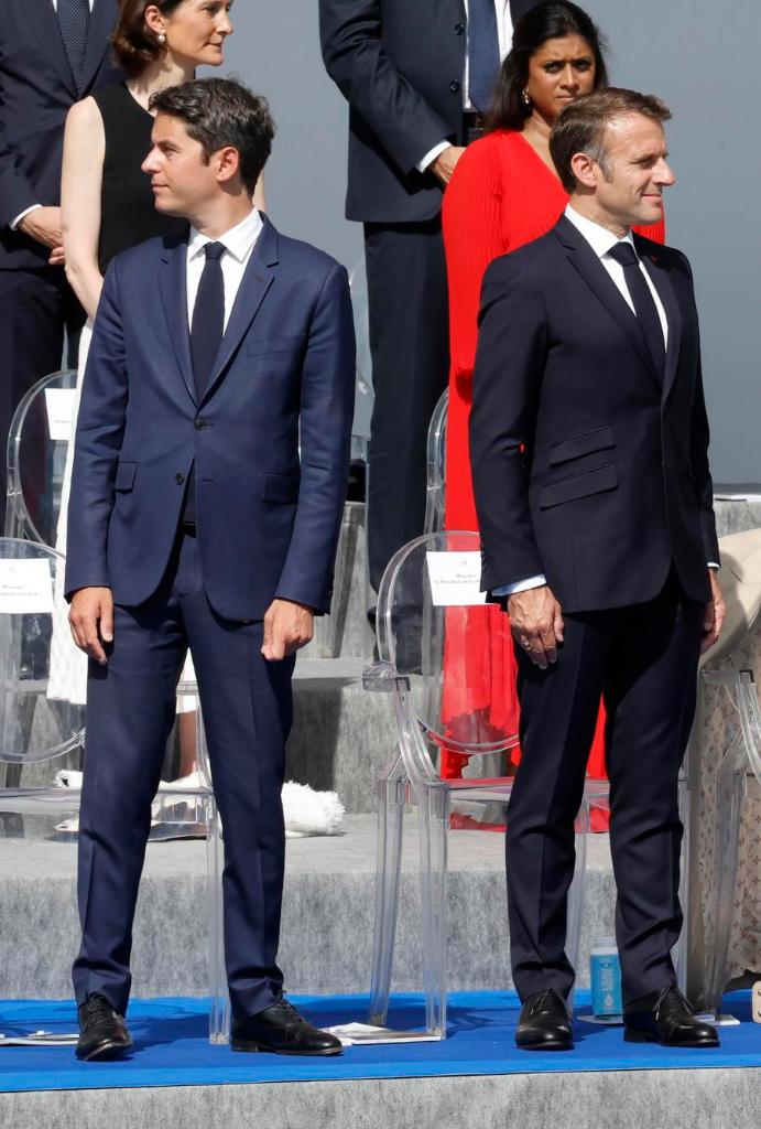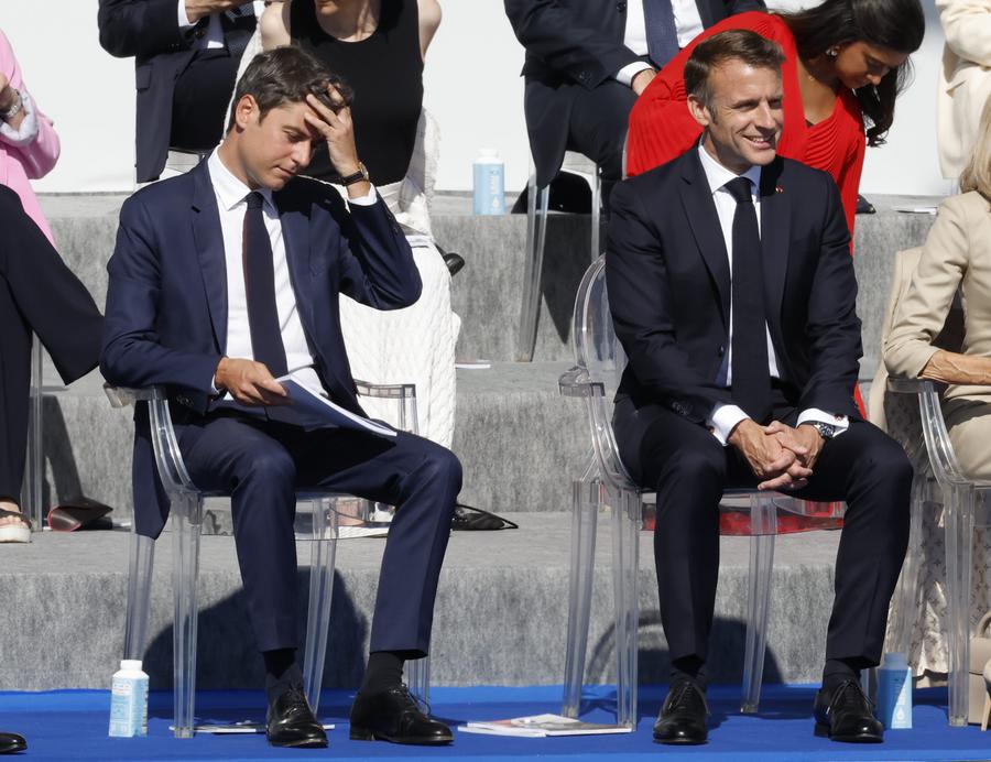 Le président français Emmanuel Macron (à droite) et son Premier ministre Gabriel Attal participent au défilé militaire annuel du 14 juillet à Paris, en France, le 14 juillet 2024. (Xinhua/Henri Szwarc)