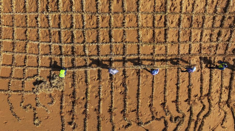 De nos jours, dans le désert de Tengger, au nord-ouest de la ville de Zhongwei, au Ningxia, des ouvriers poussent des véhicules de liage de l'herbe pour poser ces barrières de sable. A l'aide de deux lames rondes qui pressent l'herbe, la paille de blé déposée sur le sable est plantée avec précision dans le sable, formant ainsi une barrière de sable dorée.