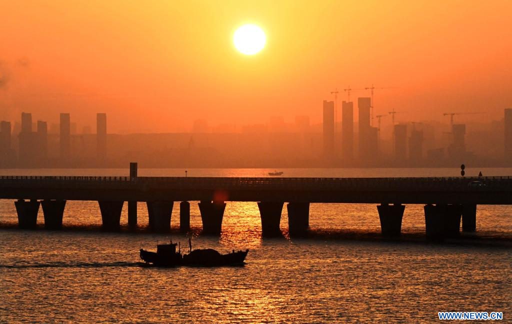 QINGDAO, 20 août (Xinhua) -- Un bateau de pêche près du pont de la baie de Jiaozhou au lever du soleil, à Qingdao, ville dans la province chinoise du Shandong (est), le 1er janvier 2024. (Photo : Li Ziheng)