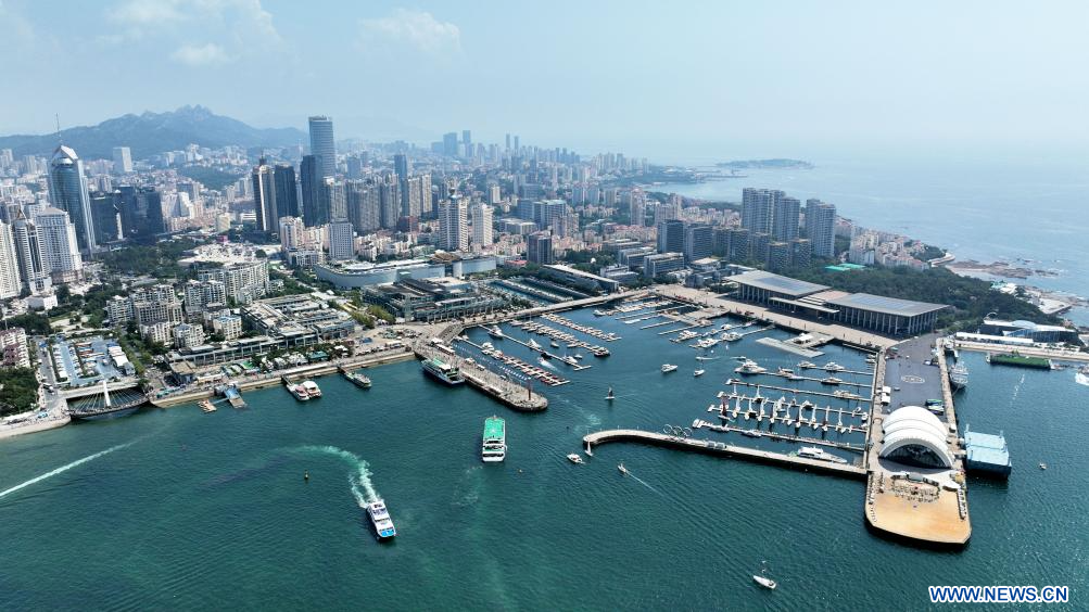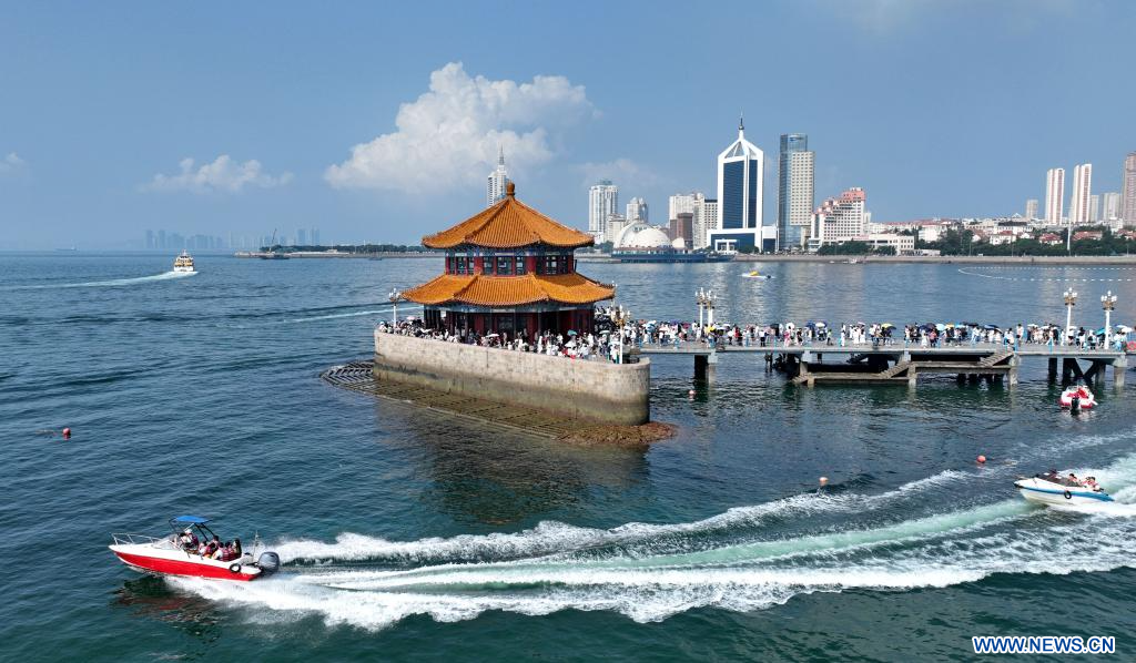 QINGDAO, 20 août (Xinhua) -- Photo prise par un drone d'un hors-bord passant devant le quai de Zhanqiao, à Qingdao, ville dans la province chinoise du Shandong (est), le 17 août 2024. (Photo : Li Ziheng)