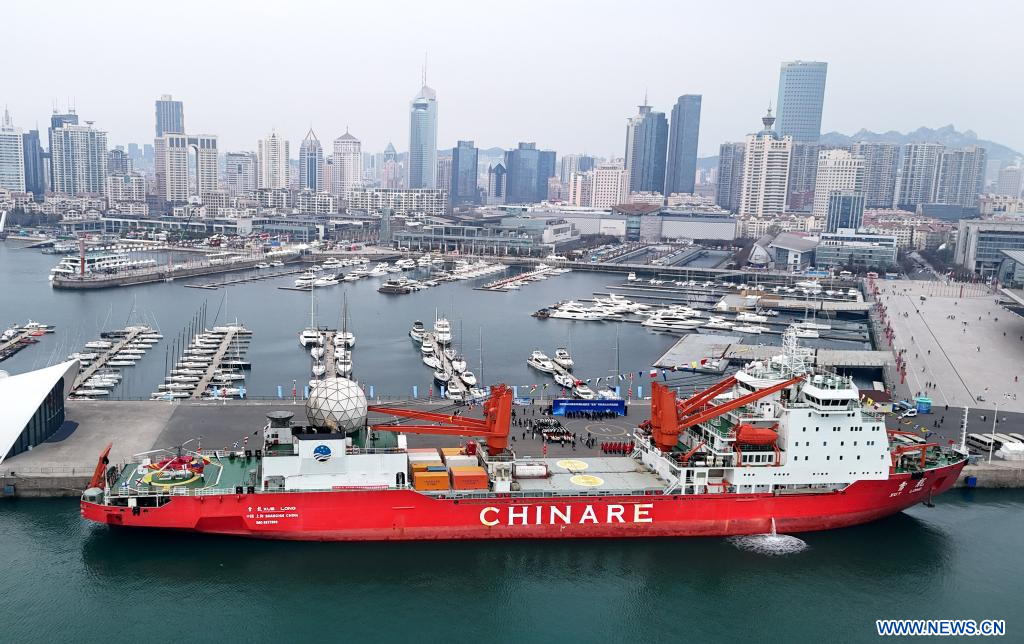 QINGDAO, 20 août (Xinhua) -- Photo prise par un drone du brise-glace chinois Xuelong amarré à un quai de Qingdao, ville dans la province chinoise du Shandong (est), le 10 avril 2024. (Photo : Li Ziheng)