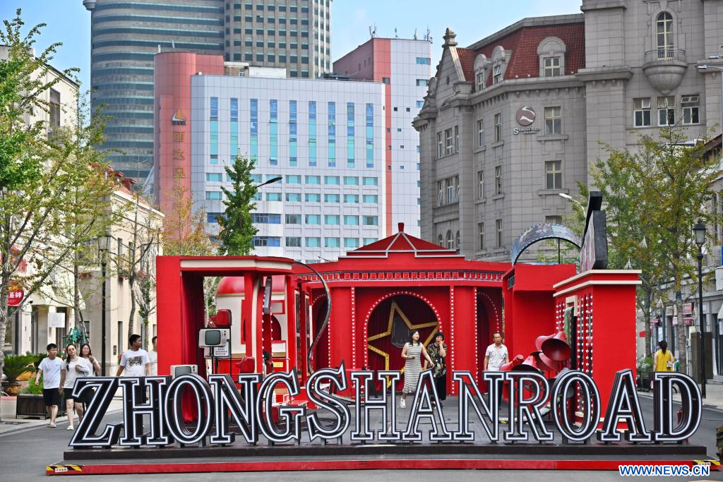 QINGDAO, 20 août (Xinhua) -- Des gens marchent sur la rue Zhongshan de la ville de Qingdao, dans la province chinoise du Shandong (est), le 17 août 2024. (Photo : Li Ziheng)
