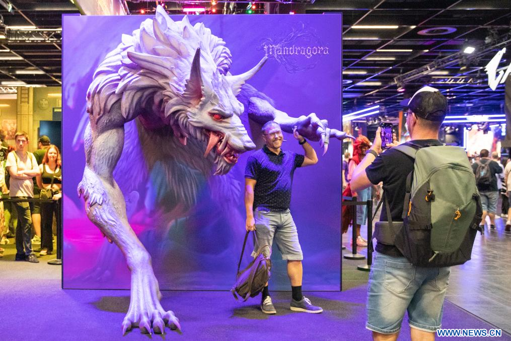 COLOGNE (Allemagne), 22 août (Xinhua) -- Un homme pose pour des photos pendant la Gamescom 2024 à Cologne, en Allemagne, le 21 août 2024. La Gamescom 2024 a débuté mercredi, attirant plus de 1.400 exposants de 64 pays et régions. (Xinhua/Zhang Fan)