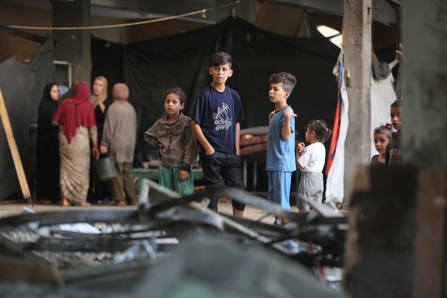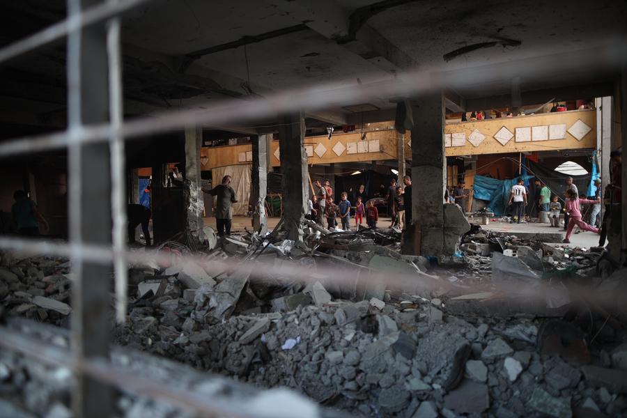 GAZA, 12 octobre (Xinhua) -- Des Palestiniens inspectent les dégâts à l'école Rafida détruite par une frappe aérienne israélienne à Deir el-Balah, au centre de la bande de Gaza, le 11 octobre 2024. L'armée israélienne a mené jeudi une frappe aérienne meurtrière sur cette école proche du siège du Croissant-Rouge palestinien, tuant au moins 28 Palestiniens et en blessant plus de 54 autres. (Xinhua/Marwan Dawood)