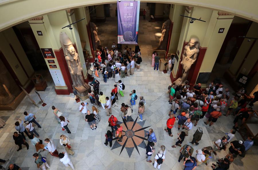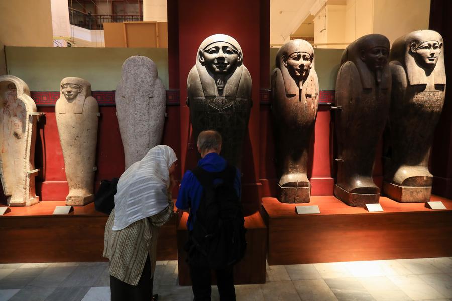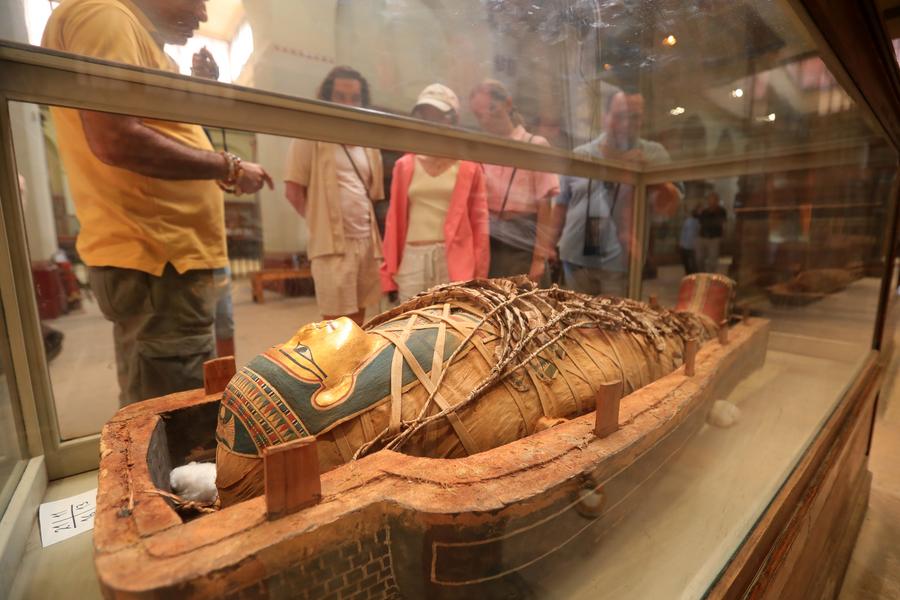 LE CAIRE, 19 octobre (Xinhua) -- Photo prise le 18 octobre 2024 montrant des visiteurs observant une momie intacte au Musée égyptien au Caire, en Egypte. L'Egypte entre dans sa haute saison touristique alors que le temps s'y rafraîchit. (Xinhua/Sui Xiankai)Photo prise le 18 octobre 2024 de l'intérieur du Musée égyptien au Caire, en Egypte. (Xinhua/Sui Xiankai)Photo prise le 18 octobre 2024 montrant des visiteurs observant des sarcophages au Musée égyptien au Caire, en Egypte. (Xinhua/Sui Xiankai)