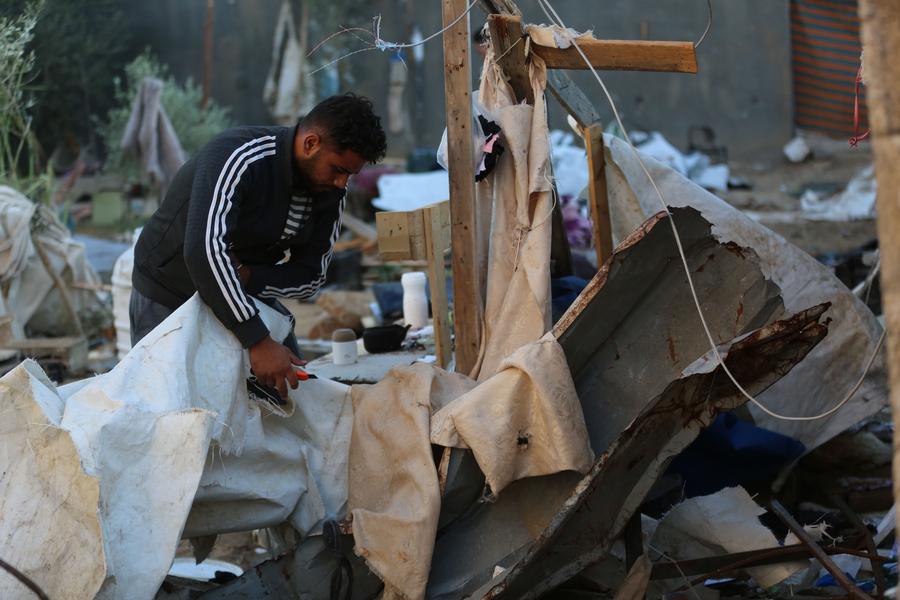 DEIR AL-BALAH, 21 octobre (Xinhua) -- Un Palestinien inspecte les dégâts d'une tente de personnes déplacées après un bombardement israélien dans la ville de Deir al-Balah, dans le centre de la bande de Gaza, le 20 octobre 2024. (Xinhua/Marwan Dawood)