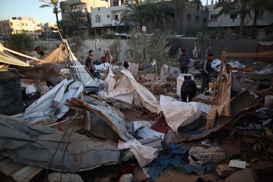 DEIR AL-BALAH, 21 octobre (Xinhua) -- Des Palestiniens inspectent les dégâts d'une tente de personnes déplacées après un bombardement israélien dans la ville de Deir al-Balah, dans le centre de la bande de Gaza, le 20 octobre 2024. (Xinhua/Marwan Dawood)