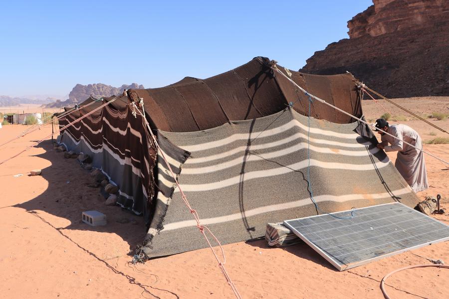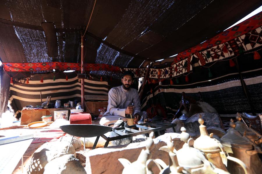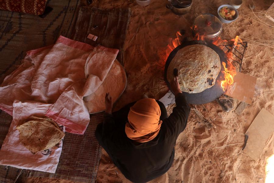 WADI RUM (Jordanie), 20 octobre (Xinhua) -- Une Bédouine prépare le repas dans le Wadi Rum, en Jordanie, le 11 octobre 2024. Les Bédouins, dont le nom signifie "habitants du désert" en arabe, sont des tribus arabes nomades qui habitent depuis toujours dans les régions désertiques de la péninsule arabique et de l'Afrique du Nord, entre autres. Au fil du temps, de nombreux Bédouins se sont sédentarisés, mais certains continuent de mener une vie nomade une partie de l'année. (Xinhua/Mohammad Abu Ghosh)Photo d'un Bédouin avec ses chameaux dans le Wadi Rum, en Jordanie, le 11 octobre 2024. (Xinhua/Mohammad Abu Ghosh)Un Bédouin moud du café dans une "maison de poil", une maison bédouine traditionnelle faite de laine de chèvre et de mouton dans le Wadi Rum, en Jordanie, le 11 octobre 2024. (Xinhua/Mohammad Abu Ghosh)Une Bédouine ferme la porte d'une "maison de poil", une maison bédouine traditionnelle faite de laine de chèvre et de mouton, dans le Wadi Rum, en Jordanie, le 11 octobre 2024. (Xinhua/He Yiping)