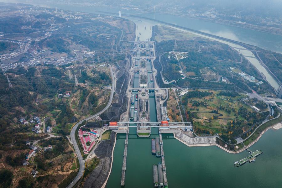 Vue aérienne de navires franchissant les écluses à cinq niveaux du barrage des Trois Gorges dans la province chinoise du Hubei (centre), le 1er décembre 2023.(Photo : Wu Zhizu)