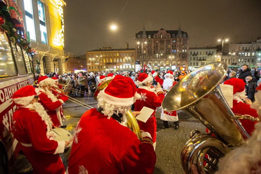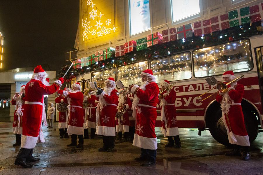 SAINT-PETERSBOURG, 26 décembre (Xinhua) -- Des musiciens déguisés en Père Noël jouent de la musique pour les citoyens de Saint-Pétersbourg, en Russie, le 25 décembre 2024. Des musiciens en costumes de fête ont pris un bus de vacances pour faire le tour de la ville russe afin de jouer de la musique et de distribuer des cadeaux aux citoyens pour célébrer la nouvelle année à venir. (Xinhua/Irina Motina)