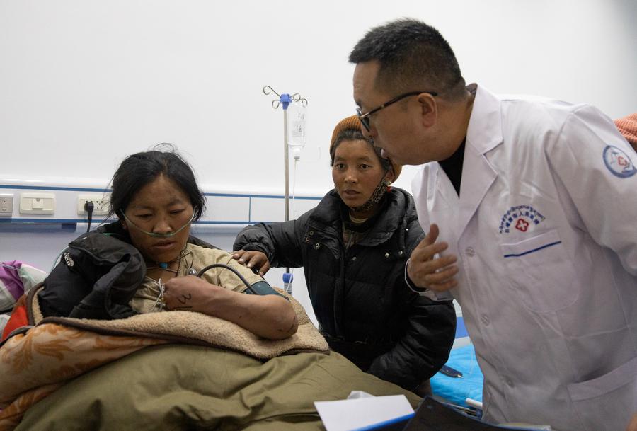 Des professionnels de santé de l'Hôpital de l'ouest de la Chine de l'Université du Sichuan et des médecins locaux examinent les radios de personnes blessées dans un séisme à l'Hôpital populaire de Xigaze, dans la ville de Xigaze de la région autonome du Xizang, dans le sud-ouest de la Chine, le 7 janvier 2025.(Photo : Tenzin Nyida)Un médecin interroge une femme blessée dans un séisme à l'Hôpital populaire de Xigaze, dans la ville de Xigaze de la région autonome du Xizang, dans le sud-ouest de la Chine, le 7 janvier 2025. (Photo : Tenzin Nyida)Des infirmières soignent des personnes blessées dans un séisme à l'Hôpital populaire de Xigaze, dans la ville de Xigaze de la région autonome du Xizang, dans le sud-ouest de la Chine, le 7 janvier 2025.(Photo : Tenzin Nyida)Des personnes blessées dans un séisme reçoivent des traitements médicaux à l'Hôpital populaire de Xigaze, dans la ville de Xigaze de la région autonome du Xizang, dans le sud-ouest de la Chine, le 7 janvier 2025.(Photo : Tenzin Nyida)■