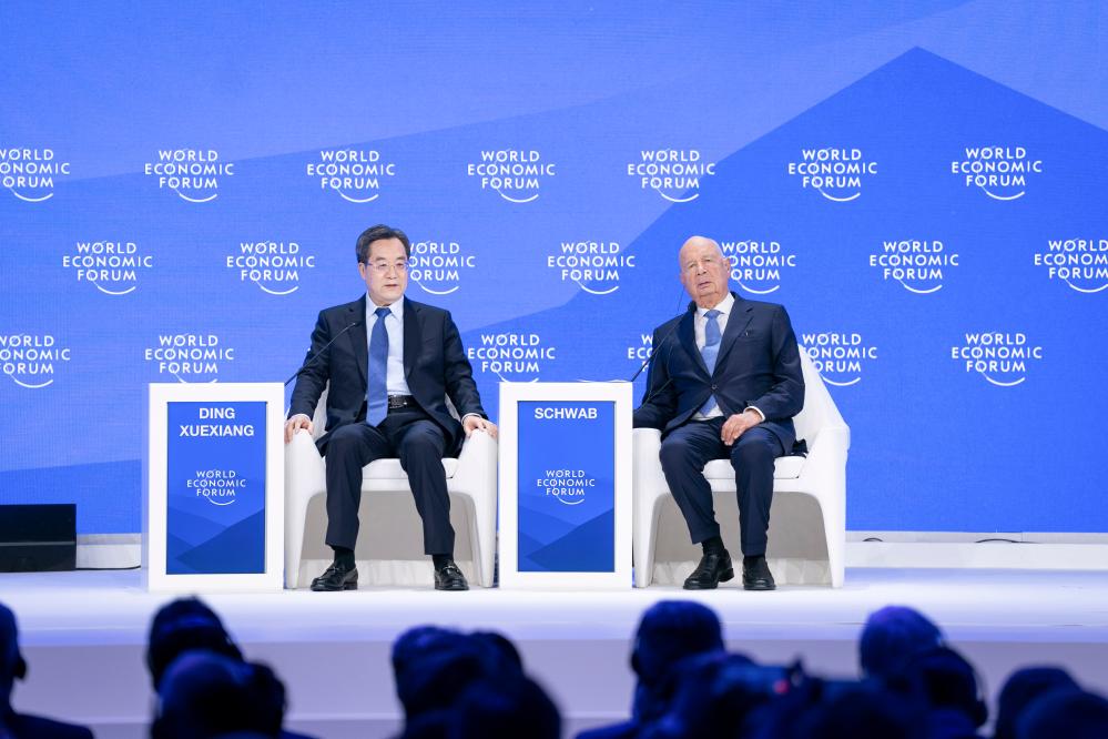 Après avoir prononcé son discours, M. Ding s'est entretenu avec Klaus Schwab, fondateur et président du conseil d'administration du FEM, sur des sujets tels que l'ordre international et l'intelligence artificielle.