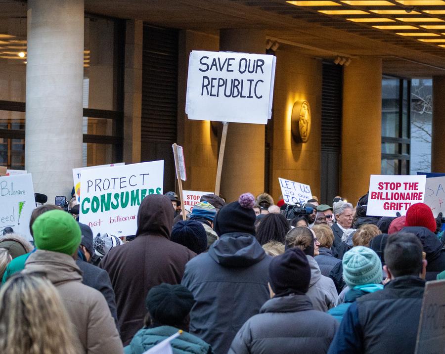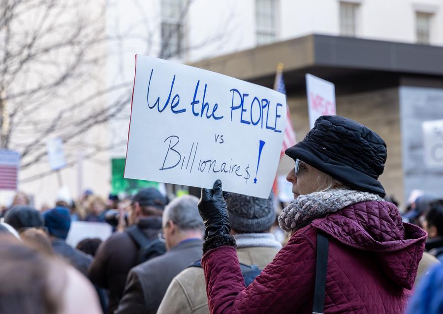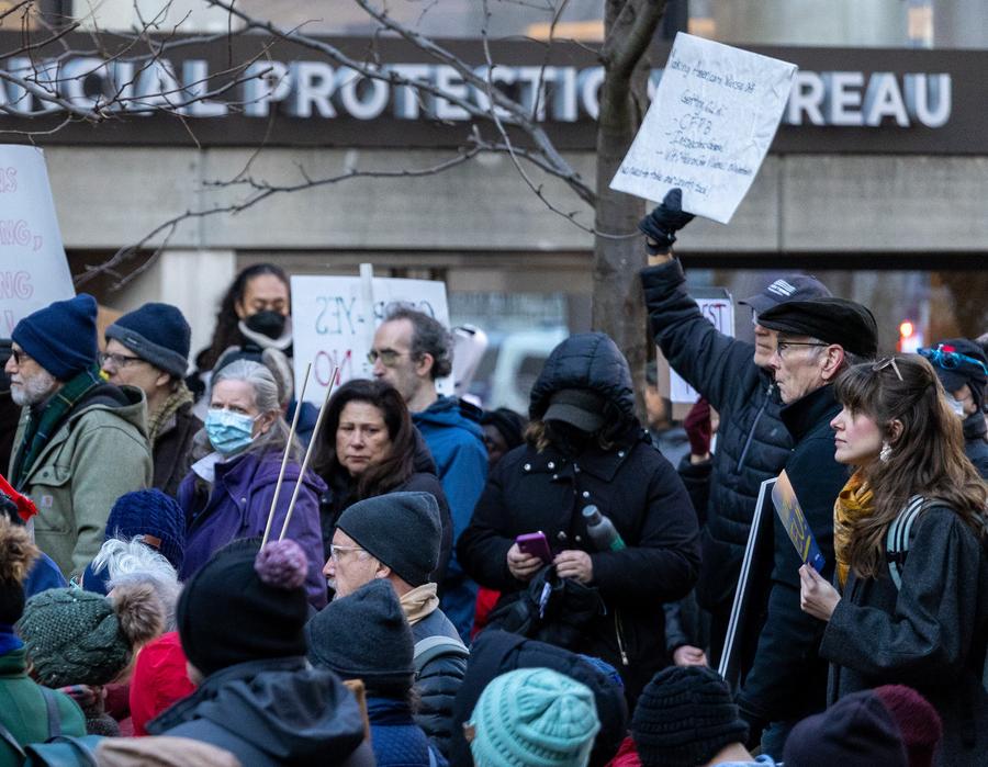 WASHINGTON, 11 février (Xinhua) -- Des personnes assistent à une manifestation pour soutenir le Bureau de protection des consommateurs de services financiers (CFPB) des Etats-Unis, à son siège à Washington D.C., aux Etats-Unis, le 10 février 2025. Le siège du CFPB sera fermé du lundi au vendredi selon les médias locaux. Aucune raison n'a été donnée pour cette fermeture soudaine. (Xinhua/Hu Yousong)