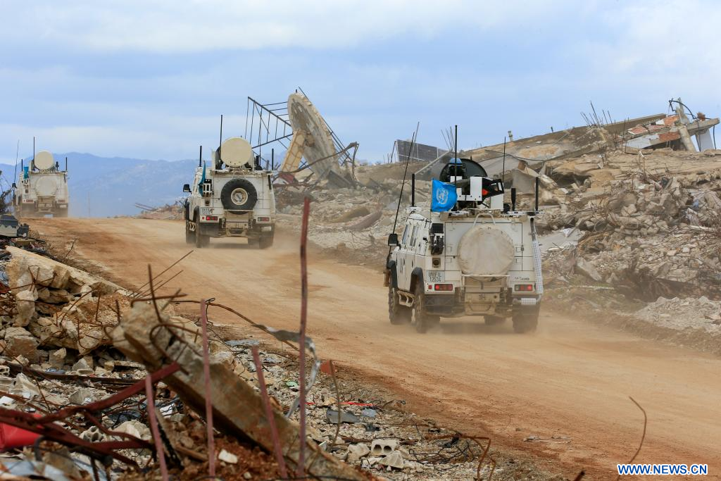 KAFR KILA, 23 février (Xinhua) -- Photo prise le 21 février 2025 montrant la Force intérimaire des Nations Unies au Liban (FINUL) en patrouille à Kafr Kila, au Liban. Kafr Kila est un village frontalier qui a été soumis à certaines des destructions israéliennes les plus systématiques lors des affrontements entre le Hezbollah et les forces israéliennes alimentés par la guerre à Gaza. (Xinhua/Ali Hashisho)