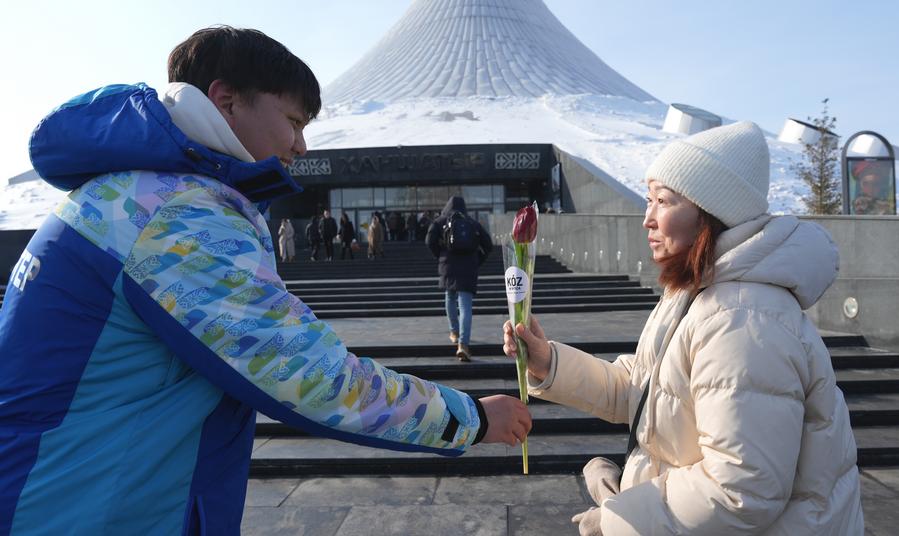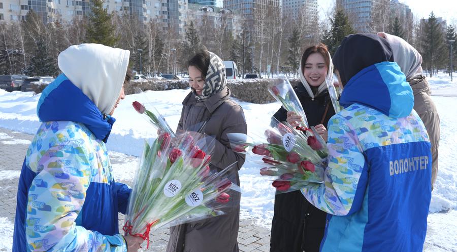 ASTANA, 7 mars (Xinhua) -- Un volontaire offre une tulipe à une femme pour célébrer la Journée internationale des femmes à Astana, au Kazakhstan, le 7 mars 2025. (Xinhua/Kalizhan Ospanov)Des volontaires offrent des tulipes à des femmes pour célébrer la Journée internationale des femmes à Astana, au Kazakhstan, le 7 mars 2025. (Xinhua/Kalizhan Ospanov)■