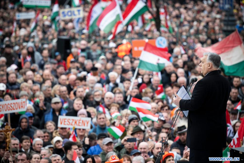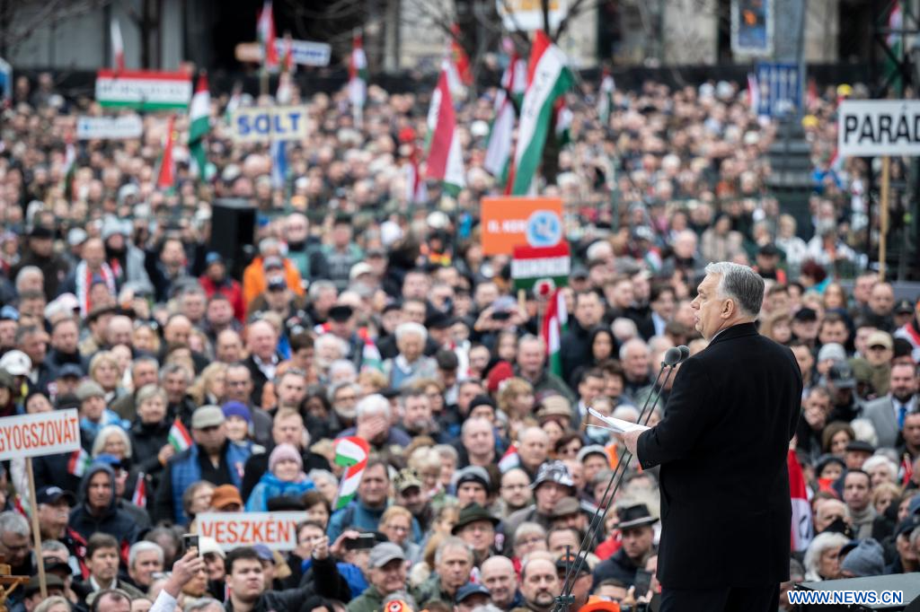 BUDAPEST, 15 mars (Xinhua) -- Photo diffusée par le service de presse du Premier ministre hongrois montrant le Premier ministre Viktor Orban qui s'exprime lors de la fête nationale hongroise à Budapest, en Hongrie, le 15 mars 2025. (Vivien Cher Benko/MTI via Xinhua)