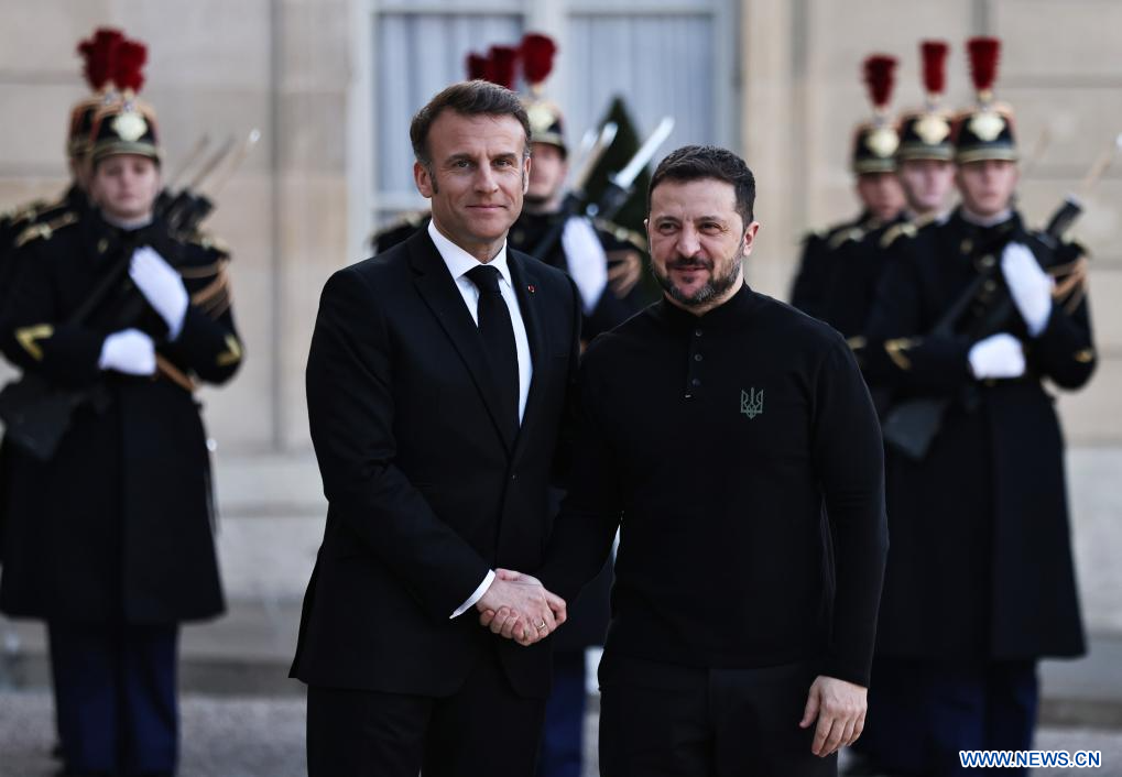 Le président français Emmanuel Macron (à gauche, sur le premier plan) accueille son homologue ukrainien en visite, Volodymyr Zelensky, au palais de l'Elysée à Paris, en France, le 26 mars 2025. (Xinhua/Gao Jing)