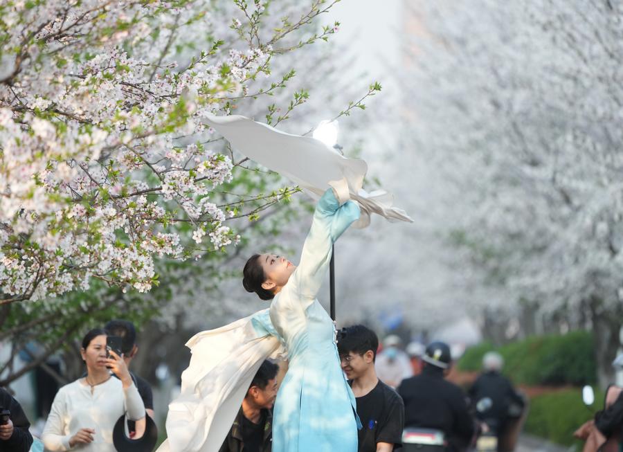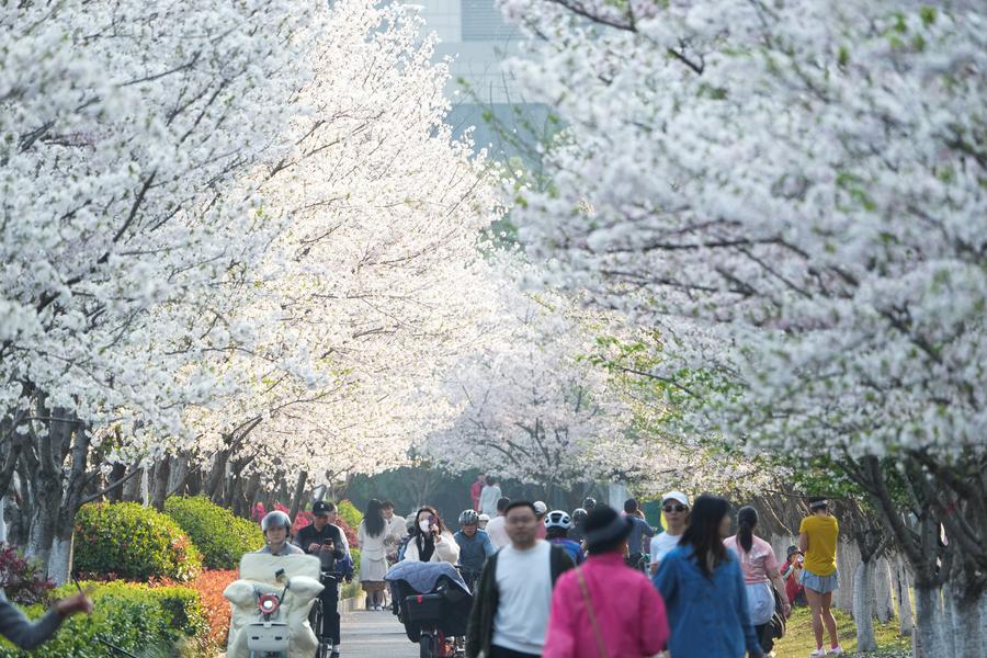 HANGZHOU, 27 mars (Xinhua) -- Plus de 3.000 cerisiers sont actuellement en pleine floraison le long de la route Wentao, dans l'arrondissement de Binjiang à Hangzhou, capitale de la province chinoise du Zhejiang (est), devenant une nouvelle attraction de la ville.