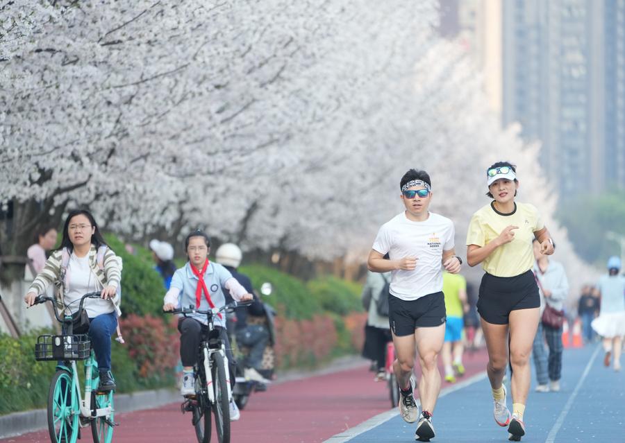 Des joggeurs courant sous des cerisiers en fleurs à Hangzhou, capitale de la province chinoise du Zhejiang (est), le 26 mars 2025. (Photo : Weng Xinyang)Des personnes se promènent sous des cerisiers en fleurs à Hangzhou, capitale de la province chinoise du Zhejiang (est), le 26 mars 2025. (Photo : Weng Xinyang)Des joggeurs et des cyclistes passent sous des cerisiers en fleurs à Hangzhou, capitale de la province chinoise du Zhejiang (est), le 26 mars 2025. (Photo : Weng Xinyang) ■
