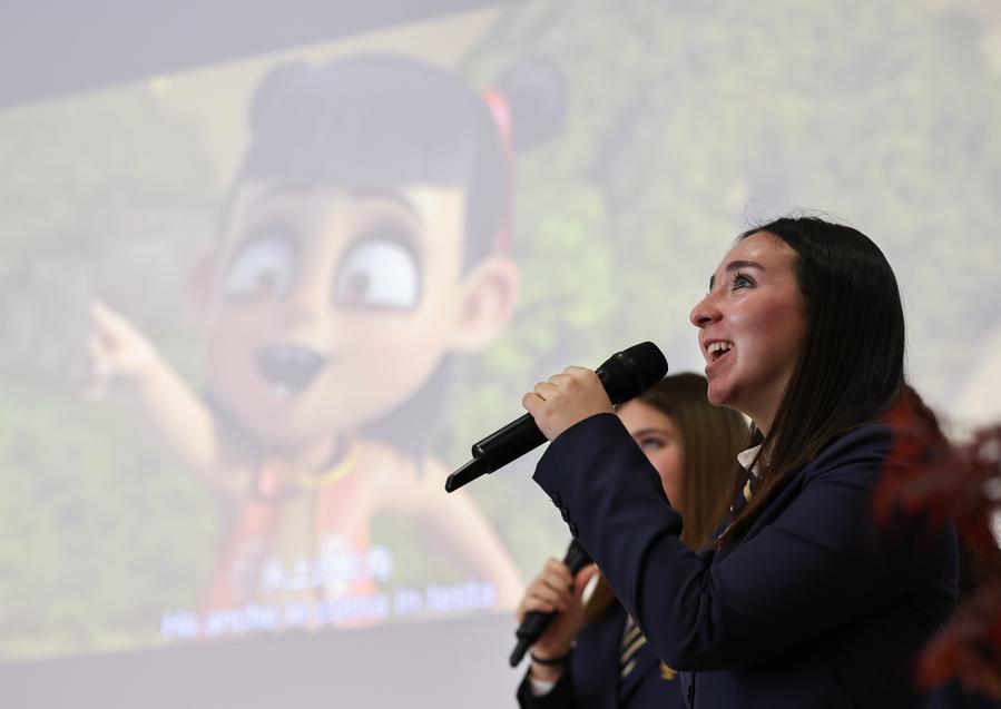 ROME, 9 avril (Xinhua) -- Des élèves pratiquent le tai-chi lors d'un événement culturel chinois intitulé "Célébrer le printemps" à Rome, en Italie, le 8 avril 2025. Des dizaines d'élèves italiens du Convitto Nazionale Vittorio Emanuele II, un pensionnat de Rome, ont montré mardi leur passion pour la langue et la culture chinoises à travers divers spectacles. (Xinhua/Li Jing)Des élèves doublent le film d'animation chinois "Ne Zha" lors d'un événement culturel chinois intitulé "Célébrer le printemps" à Rome, en Italie, le 8 avril 2025. Des élèves assistent à un événement culturel chinois intitulé "Célébrer le printemps" à Rome, en Italie, le 8 avril 2025.■