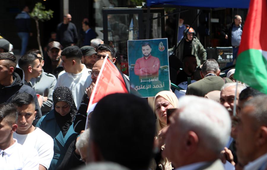 HEBRON, 18 avril (Xinhua) -- Des personnes participent à une protestation à l'occasion de la Journée du prisonnier palestinien dans la ville de Hébron en Cisjordanie, le 17 avril 2025. (Xinhua/Mamoun Wazwaz)