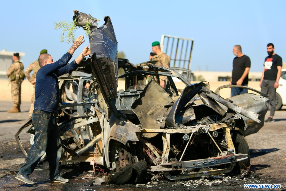 SIDON, 19 avril (Xinhua) -- Des soldats libanais sont en service près d'une voiture détruite lors d'une attaque de drone israélien à Sidon, au Liban, le 18 avril 2025. Un membre du Hezbollah a été tué vendredi lors d'une frappe de drone israélienne dans la ville de Sidon, dans le sud du Liban, selon les autorités sanitaires libanaises et une source de sécurité. (Xinhua/Ali Hashisho)
