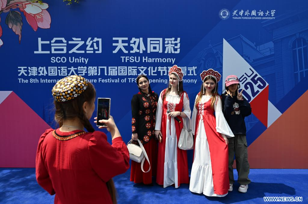 TIANJIN, 21 avril (Xinhua) -- Des étudiantes posent pour des photos lors du 8e Festival culturel international de l'Université des études étrangères de Tianjin, à Tianjin, dans le nord de la Chine, le 20 avril 2025. Plus de 300 étudiants et professeurs, originaires de plus de 60 pays et régions ont participé au festival. (Photo : Sun Fanyue)