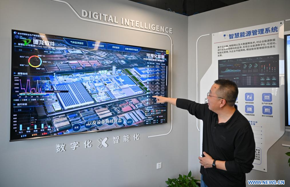TIANJIN, 22 avril (Xinhua) -- Un employé présente un logiciel de surveillance appliqué à la production industrielle dans une entreprise de logiciels de Tianjin, dans le nord de la Chine, le 18 avril 2025.