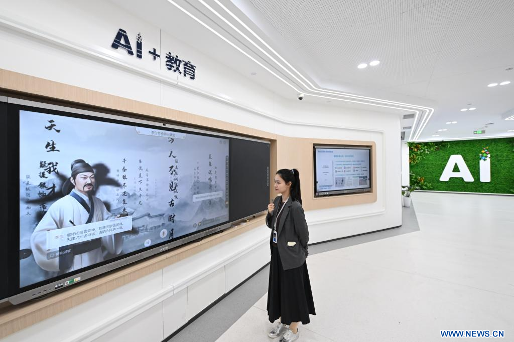 TIANJIN, 22 avril (Xinhua) -- Une employée présente des produits d'IA appliqués au domaine de l'éducation dans la filiale de Tianjin d'iFLYTEK, dans le nord de la Chine, le 18 avril 2025.