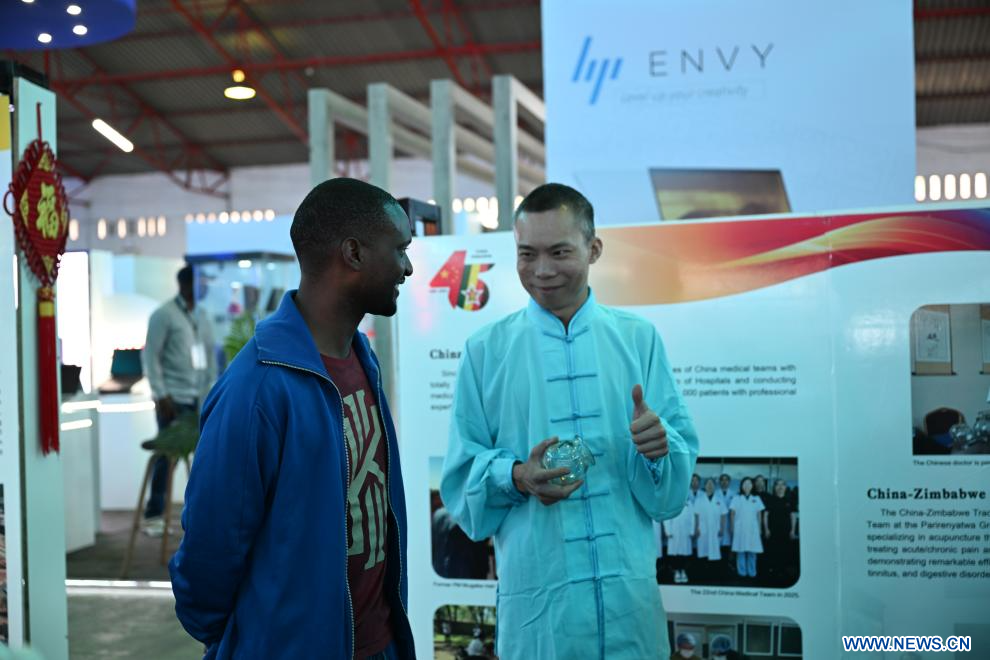 BULAWAYO (ZIMBABWE), 25 avril (Xinhua) -- Un Zimbabwéen découvre la médecine traditionnelle chinoise au pavillon chinois lors de la foire commerciale internationale du Zimbabwe (ZITF), à Bulawayo, au Zimbabwe, le 24 avril 2025. Le pavillon chinois captive les visiteurs de la 65e édition de la ZITF, qui se tient actuellement dans la deuxième ville du pays. (Xinhua/Xu Zheng)