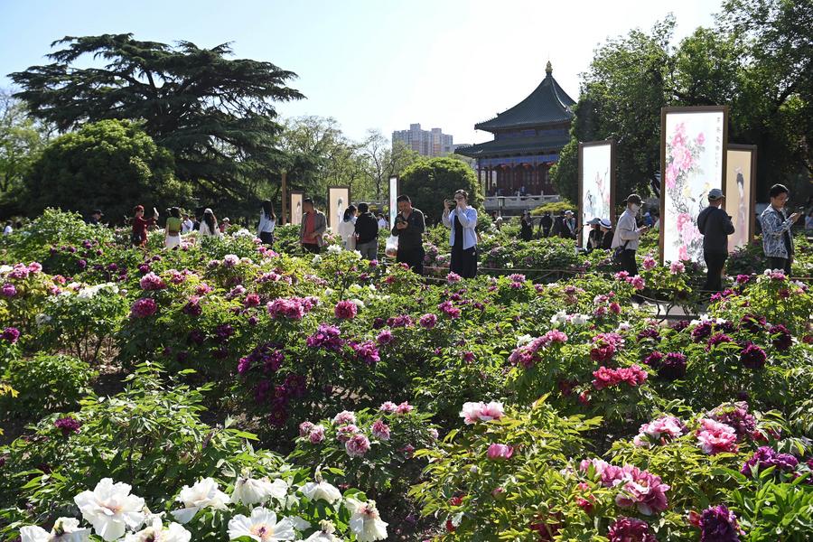 Des visiteurs admirent les fleurs dans un parc de Xi'an, dans la province du Shaanxi (nord-ouest de la Chine), le 14 avril 2025. (Photo : Zou Jingyi)