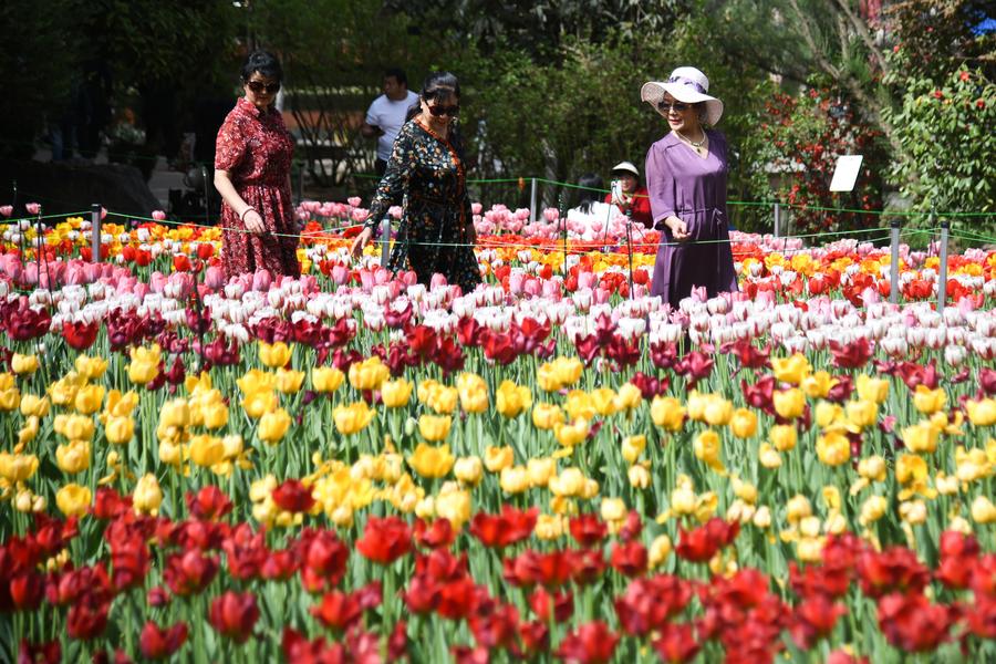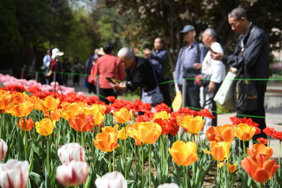 Des visiteurs admirent les tulipes en fleurs au Jardin botanique de Xi'an, dans la province du Shaanxi (nord-ouest de la Chine), le 10 avril 2025. (Photo : Zhang Bowen)