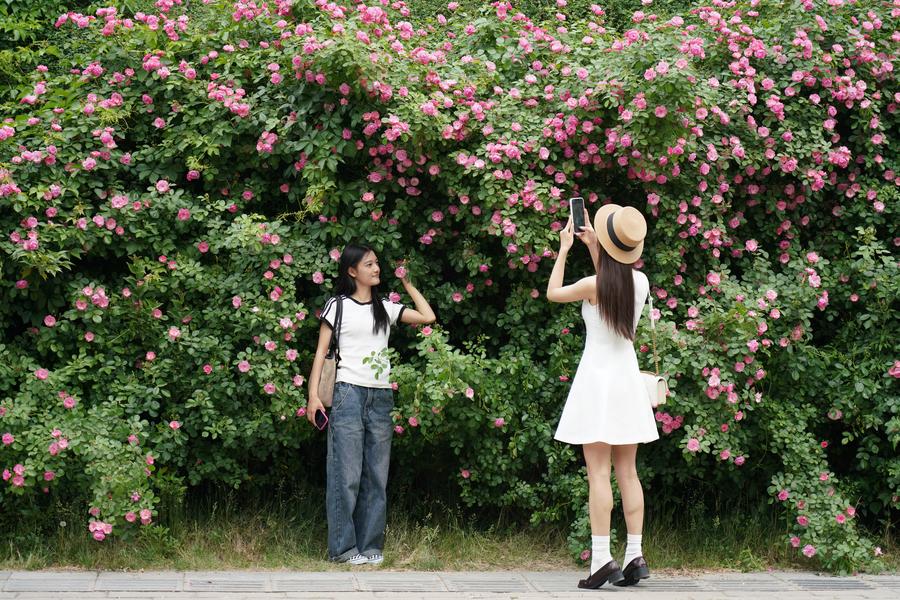 Des visiteuses prennent des photos avec des fleurs dans un parc de Xi'an, dans la province du Shaanxi (nord-ouest de la Chine), le 25 avril 2025. (Photo : Shao Rui)
